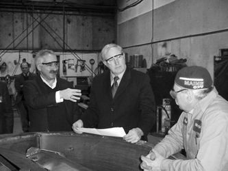 Shop talk: John Powell, (left) CEO of WahlcoMetroflex, introduces 2006 gubernatorial candidate Dave Emery (center) to longtime employee Paul Mercier