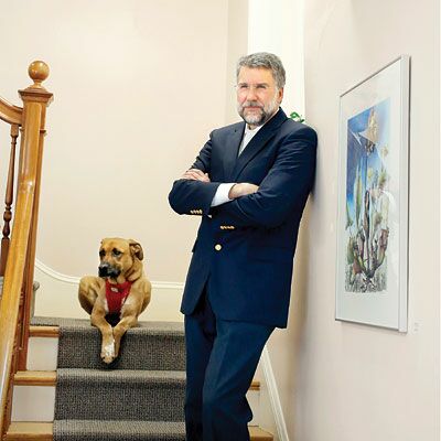 Art Boulay, CEO of Strategic Talent Management in Brunswick with his office dog, Fenway, helps returning veterans hone in on their interests and talents to find meaningful work.