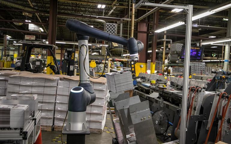 In Lisbon, LeBel said, the Dingley Press has used cobots to collect a set amount of catalogs to be placed into a hopper, where they are moved on to the next step in the finishing process, which is binding and adding address labels.