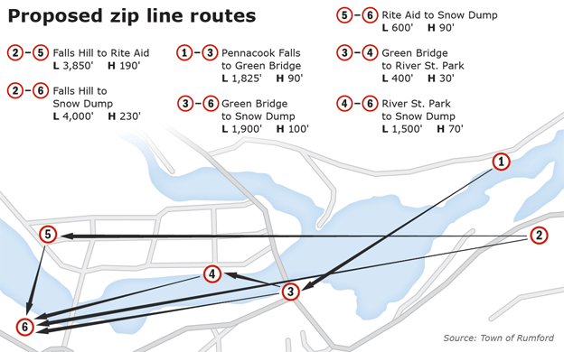 Rumford's zip lines currently have the support of the town, the Western Maine Economic Development Council, and many island businesses. But Massachusetts-based Brookfield Renewable Power, which owns the land on which one of the key launches would be built, has expressed concerns about zip-line safety and has warned Carey that the permitting process with the Federal Energy Regulatory Commission will take at least a year, with no guarantee of success.
