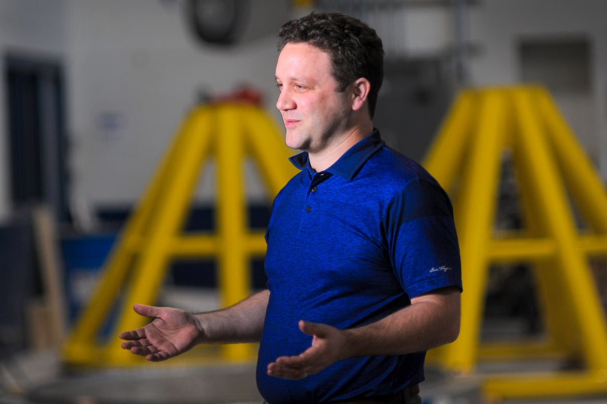 Daniel Greisen is president of Greisen Aerospace, which has the longest tenure of any company at TechPlace. Behind him are large rocket motor test stands.