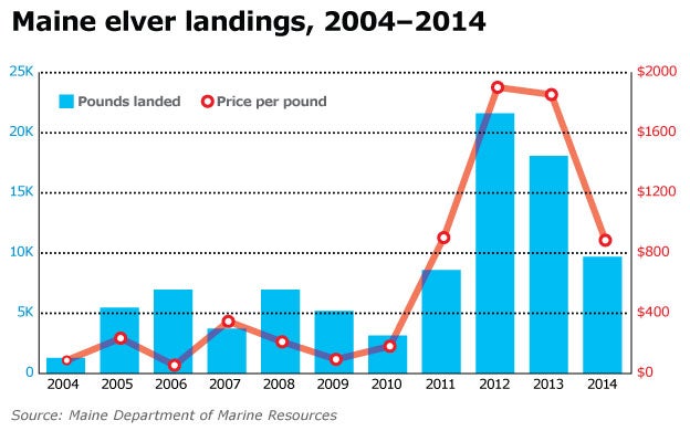 The spike in prices was dramatic. In 2010, Maine's elvers were worth less than $200 per pound. In 2011, they averaged nearly $900 and reached more than $2,000.
