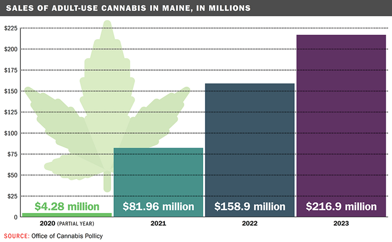 Sales of adult-use cannabis in Maine totaled $216.9 million last year, up from $158.9 million in 2022.