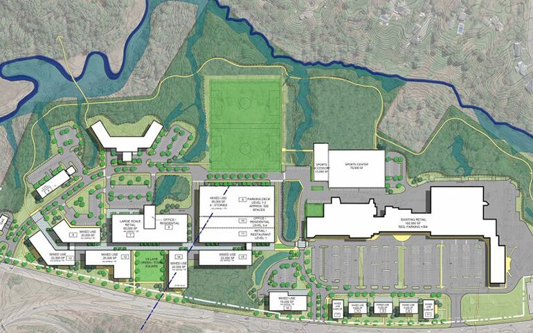The change would also tweak some of the mixed-use requirements of the Village Center 1 zone — for instance, allow residential on the ground floor of one of the residential buildings instead of the required retail, and allow facades facing the woods to not have all the elements street-facing ones would have.