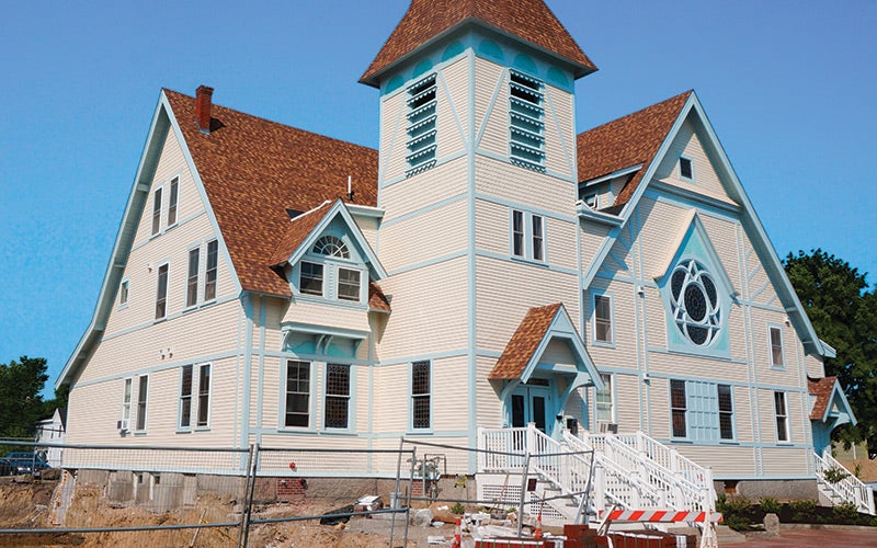 Hardypond also removed the white vinyl siding that has covered the church for decades, revealing detail that's now painted light blue, which pops against the soft yellow clapboards.