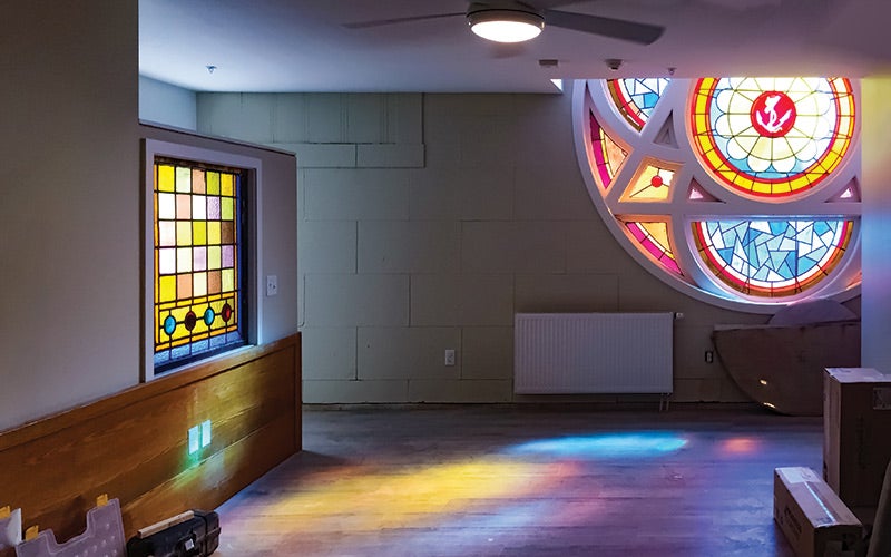 Stained glass was taken out of every other window, since windows that can be opened in case of an emergency are required by code. Much of that stained glass has been reused in partitions that separate living areas from sleeping areas in the apartments.