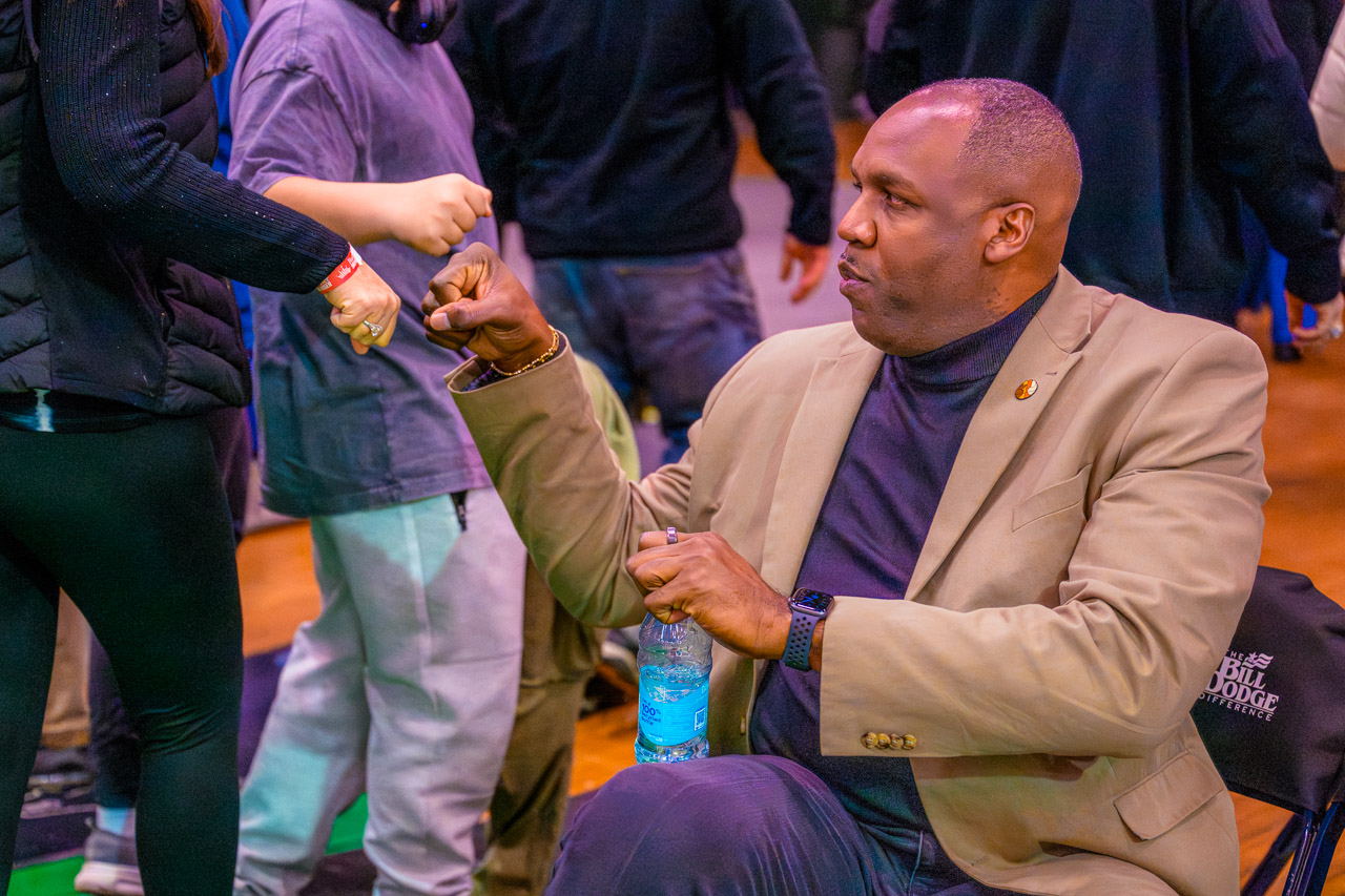 Maine Celtics President Dajuan Eubanks fist-bumps fans after a 118-95 win over the College Park (Md.) Skyhawks. — PHOTO / JIM NEUGER