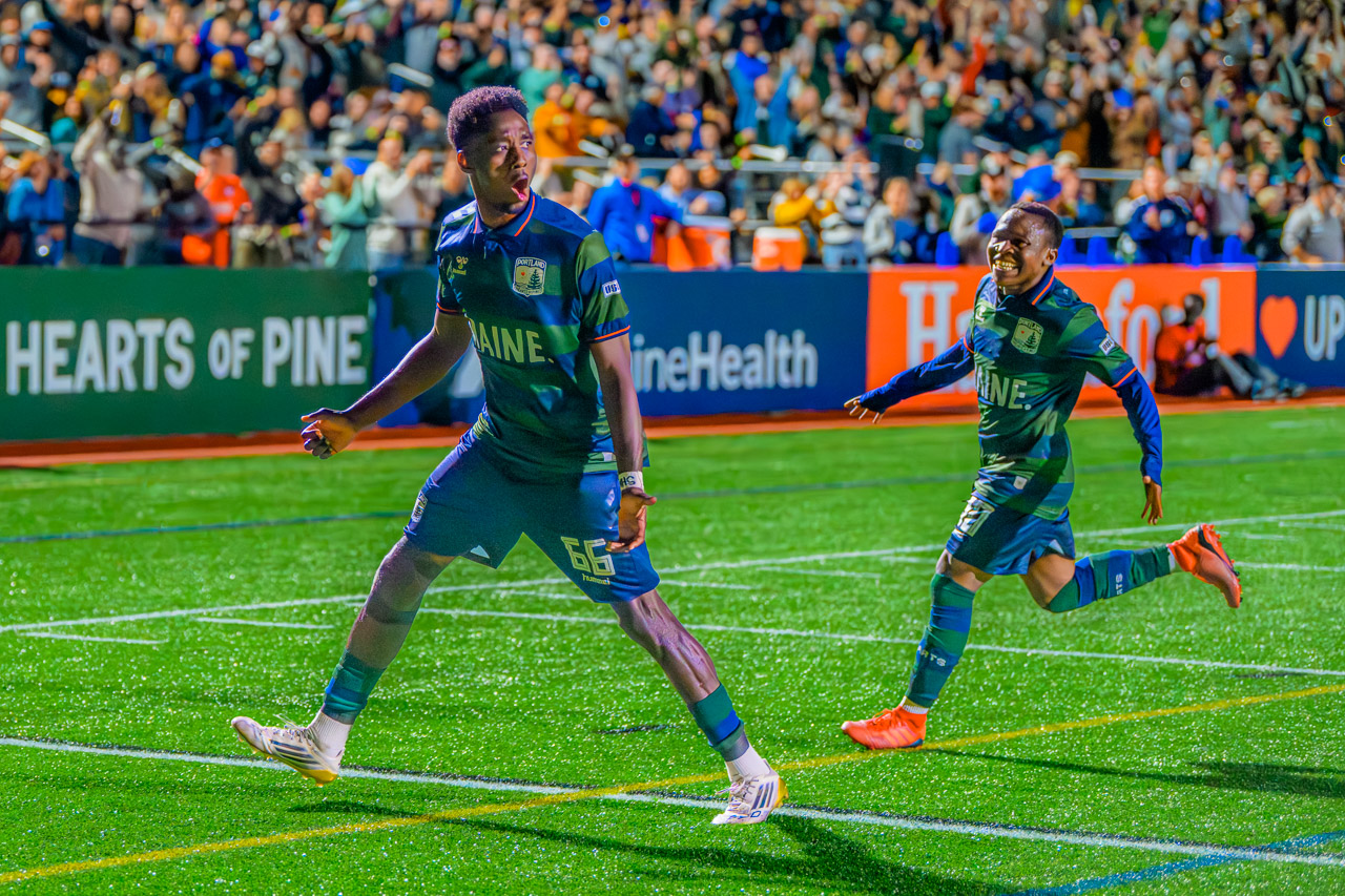 Kemali Green, No. 66, is congratulated after scoring the game-tying goal. Portland Hearts of Pine tie USL League One leaders Chattanooga Red Wolves SC 1-1 at Fitzpatrick Stadium. — PHOTO / JIM NEUGER
