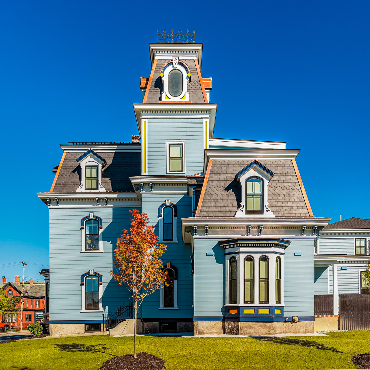 Extensive structural improvements were required, as fires had left many framing members with excessive charring. Original moldings that could be salvaged were meticulously restored, while others that were beyond saving, were replicated in Hebert’s wood shop.