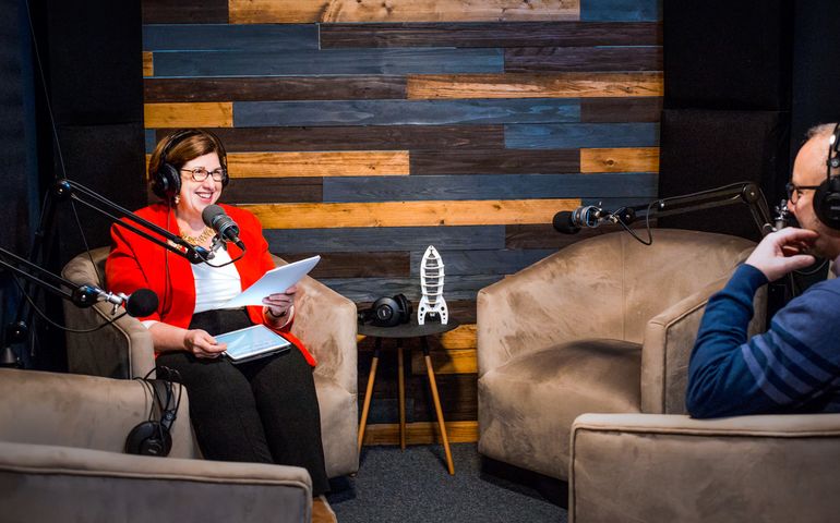It started with Nabokov and Brooks sharing ear pods and a microphone, with guests dialing in remotely. Now they record in a studio in the lobby of the bank’s Portland offices, equipped with three microphones and a sound board.