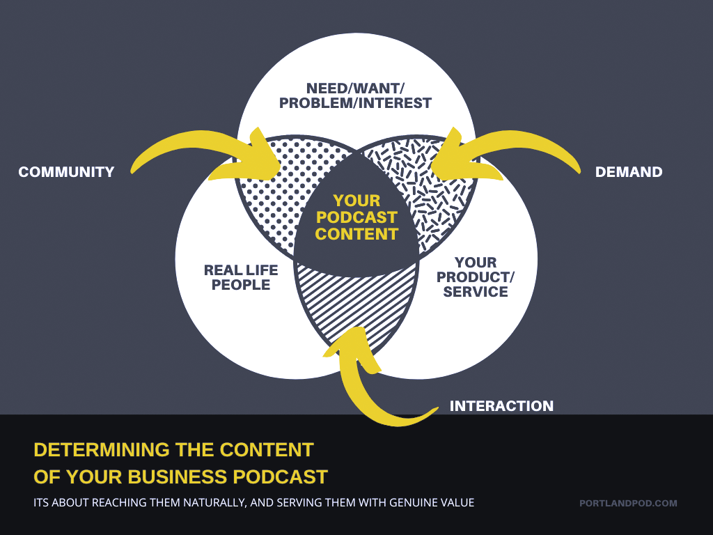 Before his clients sit in front of a microphone, they sit with Campbell. “Think about what you can provide of real value,” he tells them. He has a Venn diagram that includes what the company provides; needs, wants or interest that can be addressed; and defining the audience. Where those three circles intersect, the podcast’s content forms.