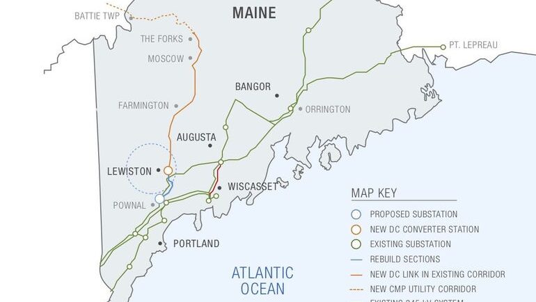 The $1 billion project broke ground in 2021 despite legal challenges. The line runs through Franklin and Somerset counties and connects with the grid in Lewiston.