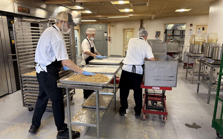 In the mixing area, giant stainless-steel machines blend oats with nuts, seeds, honey and maple syrup. You can hear the hum of mixers and conveyor belts as ingredients are transported between stations.