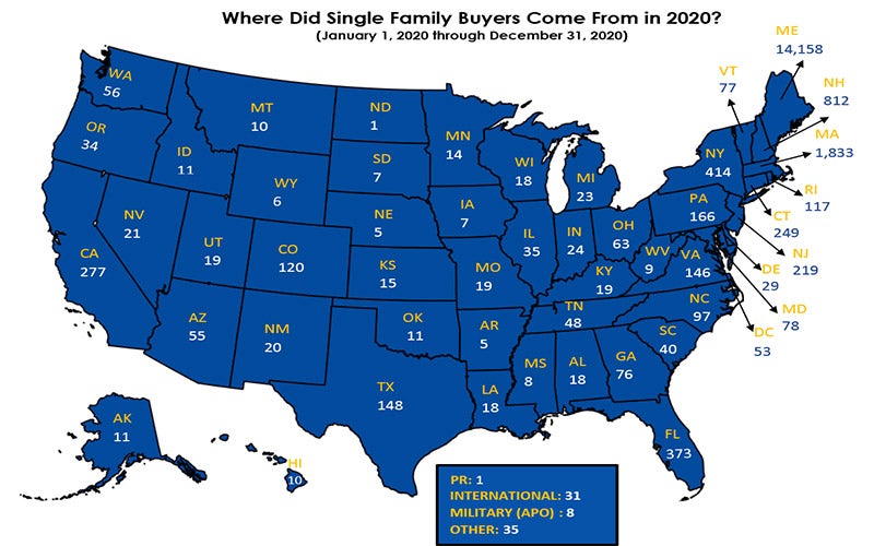 Of the out-of-state pool, not surprising, the data show that Massachusetts residents bought 1,833 homes, followed by New Hampshire residents, who bought 812 homes.