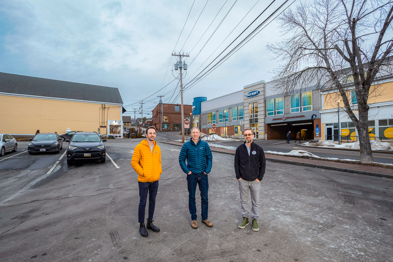 In Freeport, from left: Kyle Drexler, Freeport town planner; Dan Bacon, M&R Development’s director of development; and Brett Richardson, Freeport development director, at the site of M&R’s planned 51-unit apartment building on the corner of Depot and Mill streets. — Photo / Tim Greenway