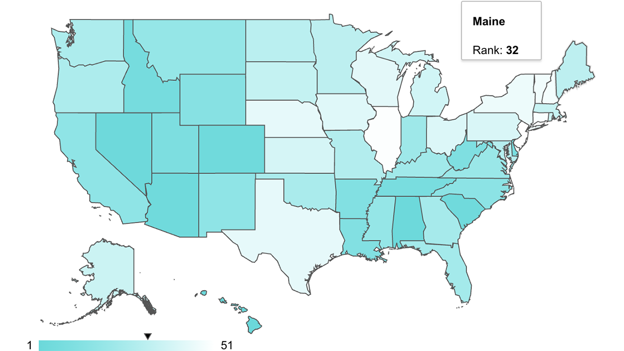 Maine’s No. 32 ranking means that 31 other locales are taxed at a lower rate, but 18 — including its New England neighbors— are taxed at a higher rate. Hawaii has the lowest rate at 0.27%, while New Jersey has the highest at 2.11%.