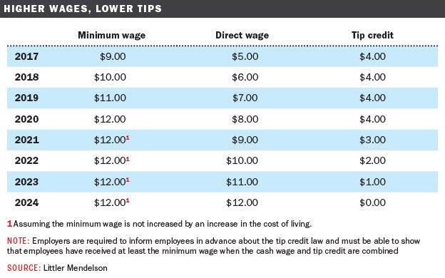 The new law also requires the minimum cash wage to increase each year, starting on Jan. 1, 2018, and each Jan. 1 thereafter, by $1 per hour until it reaches the same amount as the annually adjusted minimum wage, sometime in 2024 or thereafter. At that point, the tip credit will be eliminated under the law as it now stands, and employers will have to pay their service employees the full minimum wage.