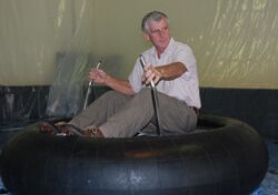 In a warehouse near the Maine Mall in South Portland, Yule and his team have been testing the latest iteration of the AquaZoom. A rubber ring resembling a giant inner tube surrounds a custom-designed stainless steel drive mechanism that includes two wheels powered by a pair of marine batteries. Levers on board allow the rider to move in all directions and even to fire a water gun. The fiberglass chair is still being built, so instead test riders must perch on an overturned plastic milk crate.