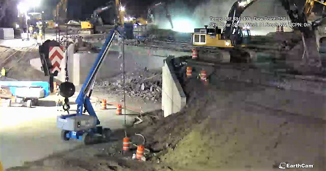 The chunk carrying I-295’s two southbound lanes was in place by late Saturday afternoon, and the northbound lanes followed that night. Crews continued work Sunday to grade approaches to the bridge. Paving was completed by 7 a.m. Monday, ahead of schedule and in time for the morning commute. The portion of Veranda Street under the bridge was scheduled to open by 2 p.m.