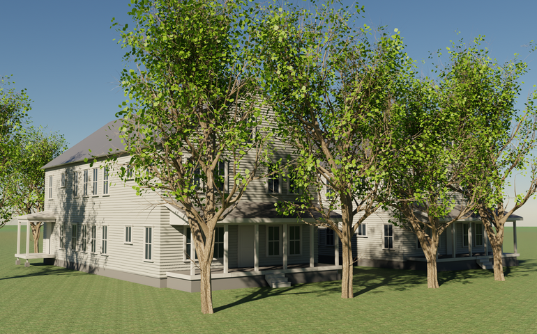 Two 8-unit buildings will be set close to the street, with front porches and parking off to the side. A row of street trees will be maintained along the front of the lot.Â