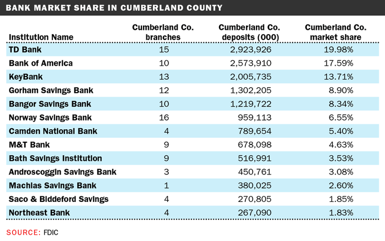TD Bank, Bank of America and KeyBank are the top three banks in Cumberland County, based on market share, according to Federal Deposit Insurance Corp. numbers from June 30, 2022.