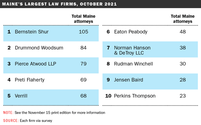 Bernstein Shur also remains the largest on the annual list, despite a decrease in Maine attorneys at the firm from 117 in 2020 to 105 on the 2021 list. However, the firm continues to hire.