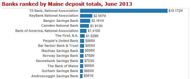News Maine bank deposits See deposit totals for each bank operating in Maine — as of June 2013 — in the interactive chart below. By Mainebiz Staff October 8, 2013 Copy URLEmailFacebookTwitterLinkedin See deposit totals for each bank operating in Maine — as of June 2013 — in the interactive chart below. Learn more about:News – Digital Partners -