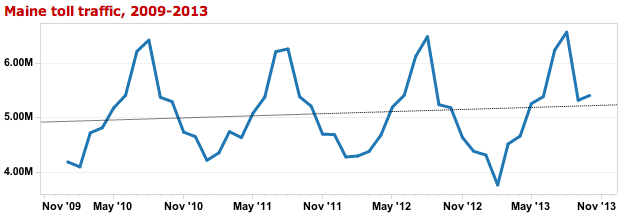 Traffic on the Maine Turnpike in October and August beat out totals for 2012, despite higher tolls. Compare month-to-month toll traffic numbers from 2010-2013 in the chart below.