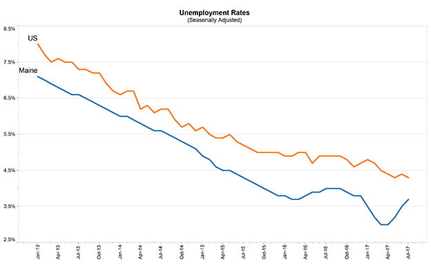 The preliminary seasonally adjusted unemployment rate of 3.7% for July was up slightly from 3.5% in June and down from 4% one year ago. The number of unemployed was down 1,500 over the year to 26,200 people out of work in Maine.