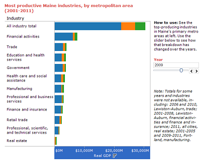 News Maine’s most productive industries, by real GDP See Maine's most productive industries, by real GDP and metropolitan area, in this interactive chart. By Mainebiz Staff March 12, 2013 Copy URLEmailFacebookTwitterLinkedin Learn more about:News – Digital Partners -