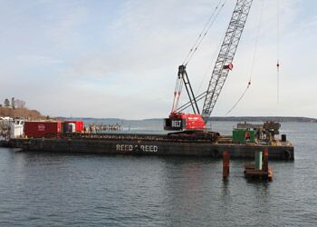 Construction on the new mega berth in Portland’s harbor is on schedule in its sixth week, says Jack Parker, president and CEO of the construction company in charge of the project, Reed & Reed of Woolwich. Two of the 21 pilings that will support the disembarking platform and pedestrian walkway have been driven down through the water and into the seabed. Over the next three months, the rest of the 220-foot metal pilings will be bored into the sea floor, a process that takes the good part of a day at least, according to Jack Turner, project superintendent. The $4.9 million berth is set to be complete July 31.