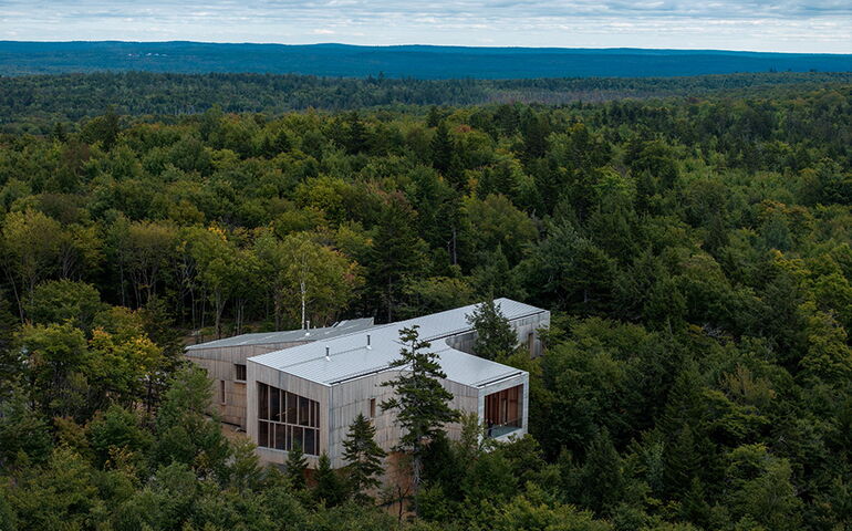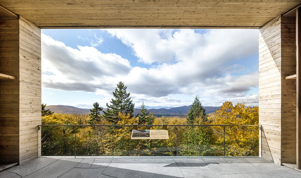 The Tekαkαpimək Contact Station is a 7,896-square-foot visitor center situated atop Lookout Mountain within the Katahdin Woods and Waters National Monument.