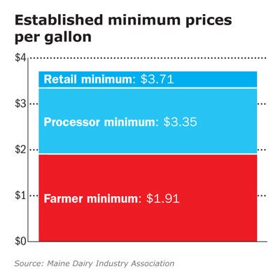"We regulate everything involved in the dairy industry in Maine," says Tim Drake, executive director of the commission. "We decide what the farmers will get for their product, what the processors will get and what the retailers will get. We only set the minimum prices … they have the right to charge more than the minimum price, and most of them do. It's a balancing act. The commission tries to walk the line of balancing fairly each of those interests every month."
