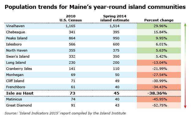 Since 1990, island populations overall have increased 5.7% as compared to the state's overall growth of 8.2%. But most of that increase has been in Casco Bay, the report states. Isle au Haut, for example, reported a population of 45 in spring 2014, down 38.36% from the 2010 U.S. Census figure of 73.
