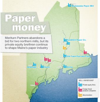 Private equity firms began eyeing the state’s struggling mills in the late 1990s, but the Katahdin sale would have been the first time a mill passed from the hands of one private equity firm to those of another. On both sides of last month’s ultimately failed transaction, the parties lacked a primary interest in the forest products industry. Maine pulp and paper companies have operated under a kaleidoscope of ownership structures in previous years, with fluctuating industrial interests yielding to various types of financial investors, but prior owners could claim a chief stake in timber and pulp and paper interests. The four private equity firms that now possess six of Maine’s 10 major paper mills, however, can’t make that claim.