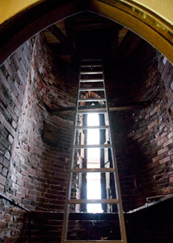 The Chestnut Street Church has two tall brick towers that were once topped with wooden spires that reached 110 feet, but were dismantled for safety reasons more than 50 years ago. The Verrills will use these circular towers as wine cellars, with semi-circular racks of wine affixed to the walls. Peter Verrill says every part of the church, including these towers, is structurally sound. “It’s bomb proof,” he claims.