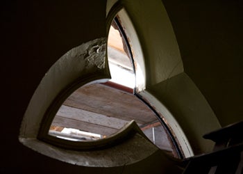 The Chestnut Street Church is adorned with two windows shaped as trefoils, or more specifically triquetras, an ancient symbol made of three overlapping almond-like shapes that symbolizes unity. The stained glass inside the window frames has been removed for restoration. The trefoil is a common design in Gothic architecture.