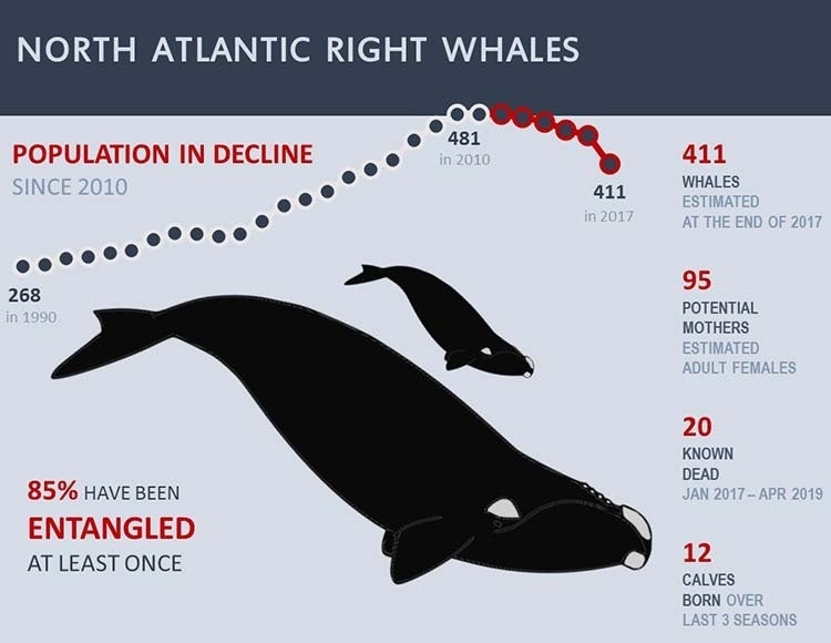 The federally convened team consists of approximately 60 fishermen, scientists, conservationists, and state and federal officials. The group advises the National Marine Fisheries Service, which is the federal body that would enact any regulations. Although there was steady population growth from about 270 right whales in 1990 to about 480 in 2010, a downward trajectory began after that.
