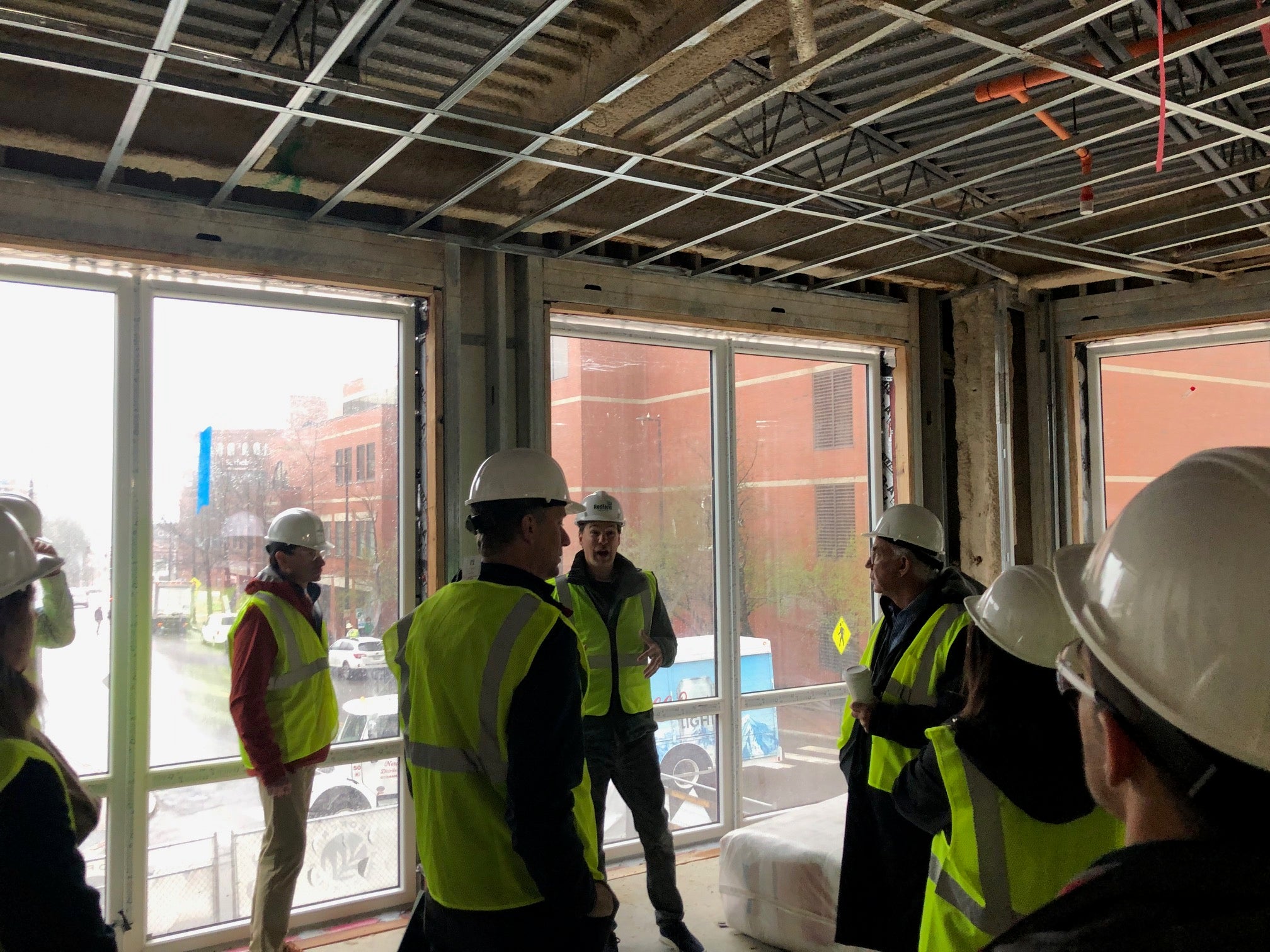 On the recent visit, workers were hanging sheetrock. Visitors accessed different floors via the construction elevator.Â