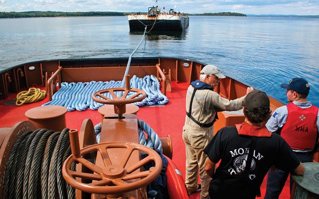 On a sunny September morning in Castine Harbor, the tug Pentagoet carefully maneuvers away from the 230-foot barge Oyster Bay.