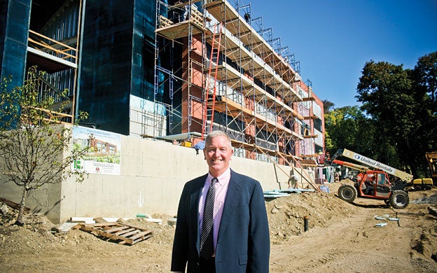 Dump trucks back and fill while workers on scaffolds tend to masonry, aiming for completion in January 2015. The new building represents an expansion of MMA's teaching and research capabilities.