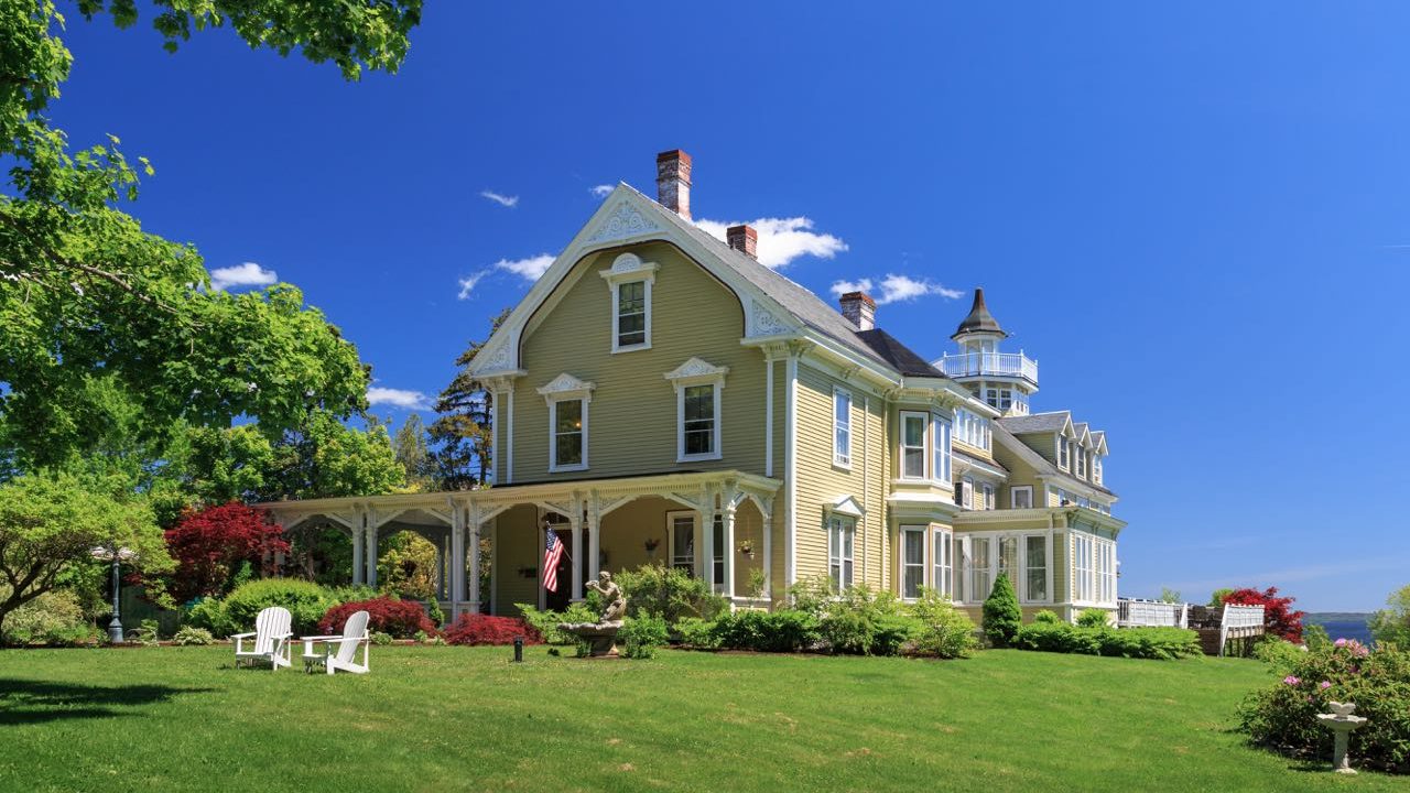 The inn fronts U.S. Route 1 but the property extends over six acres down to Penobscot Bay. The venue includes guest areas such as two sitting rooms, a dining room, a solarium with views of the water, decks and the 1874 Tavern. There are 10 renovated rooms and suites; features that vary by room include fireplaces, private balconies and bay views. The structure features a widow’s walk, ornate exterior trim, and original wood floors, balustrades, and molded arches.