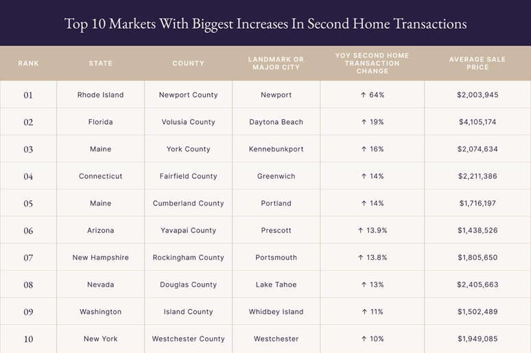 The report reveals the top 10 U.S. counties seeing the biggest annual increases in second-home transactions and the largest year-over-year appreciation for homes priced above $1 million.