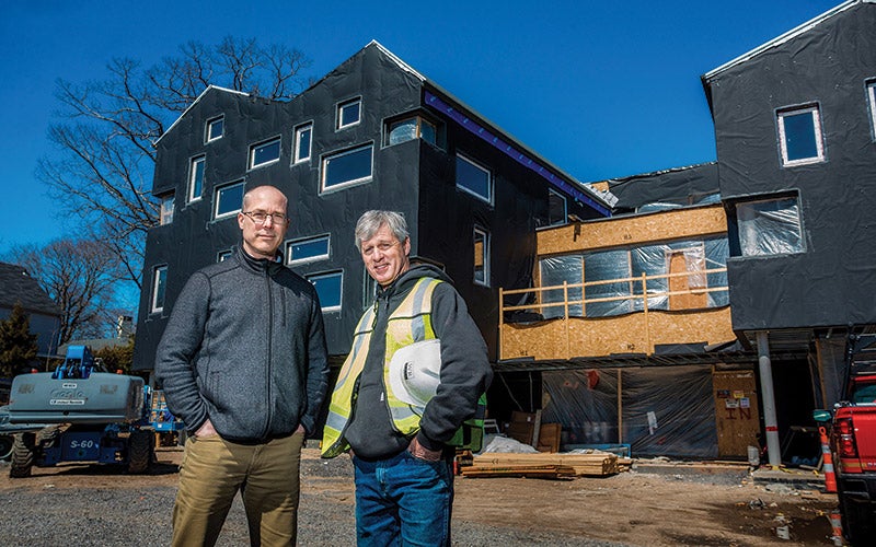 At Waynflete, director of marketing and communications Rand Ardell and project superintendent Millard Nadeau, of Wright-Ryan, point out the features of the planned addition, including differences between Passive House and standard construction.