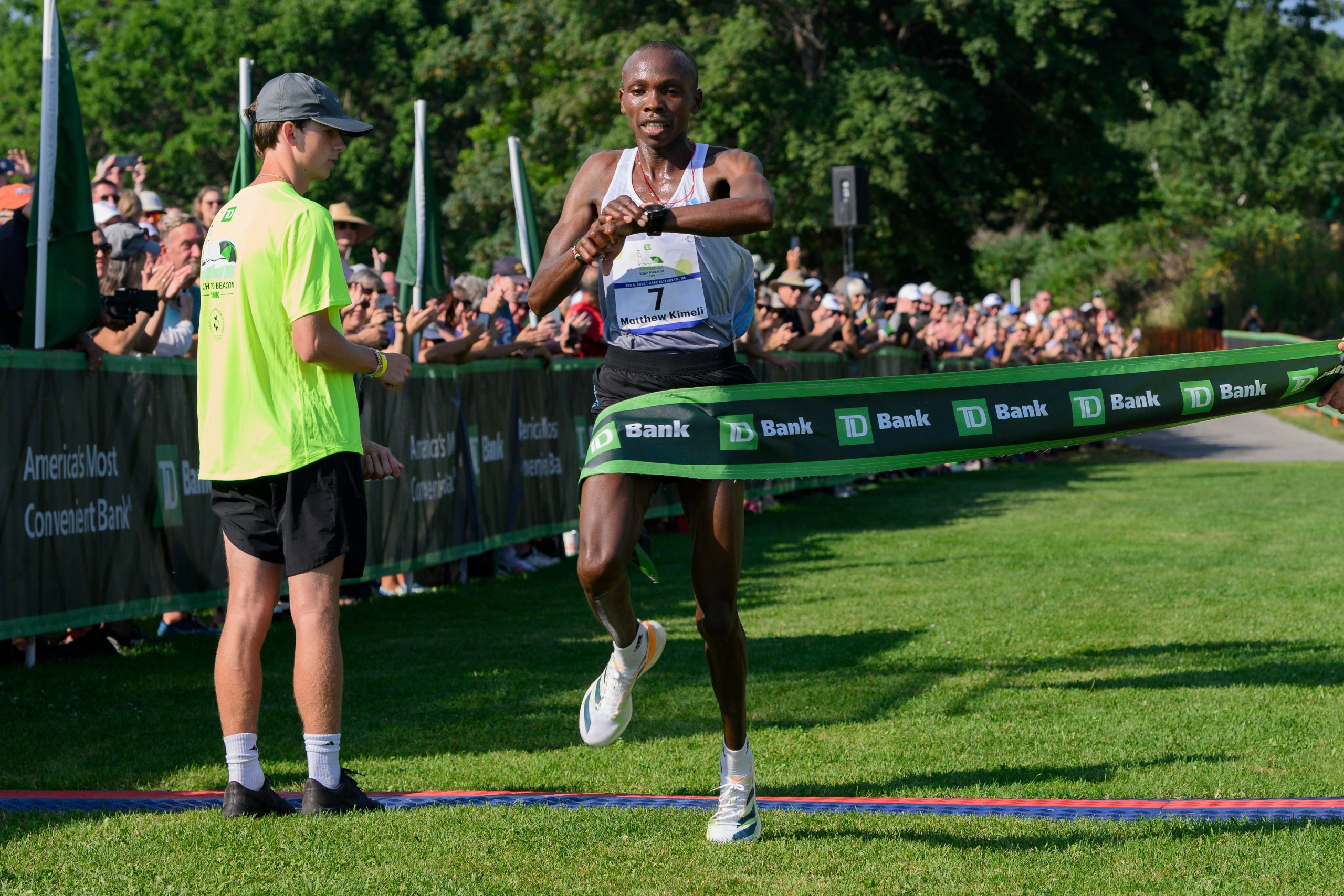 As Bruce Springsteen’s “Born to Run” blared over the loudspeaker at Cape Elizabeth’s Fort Williams Park, the first athletes — in wheelchairs and running on foot — crossed the finish line at Saturday’s TD Beach to Beacon 10K race, back in person for the first time since 2019.