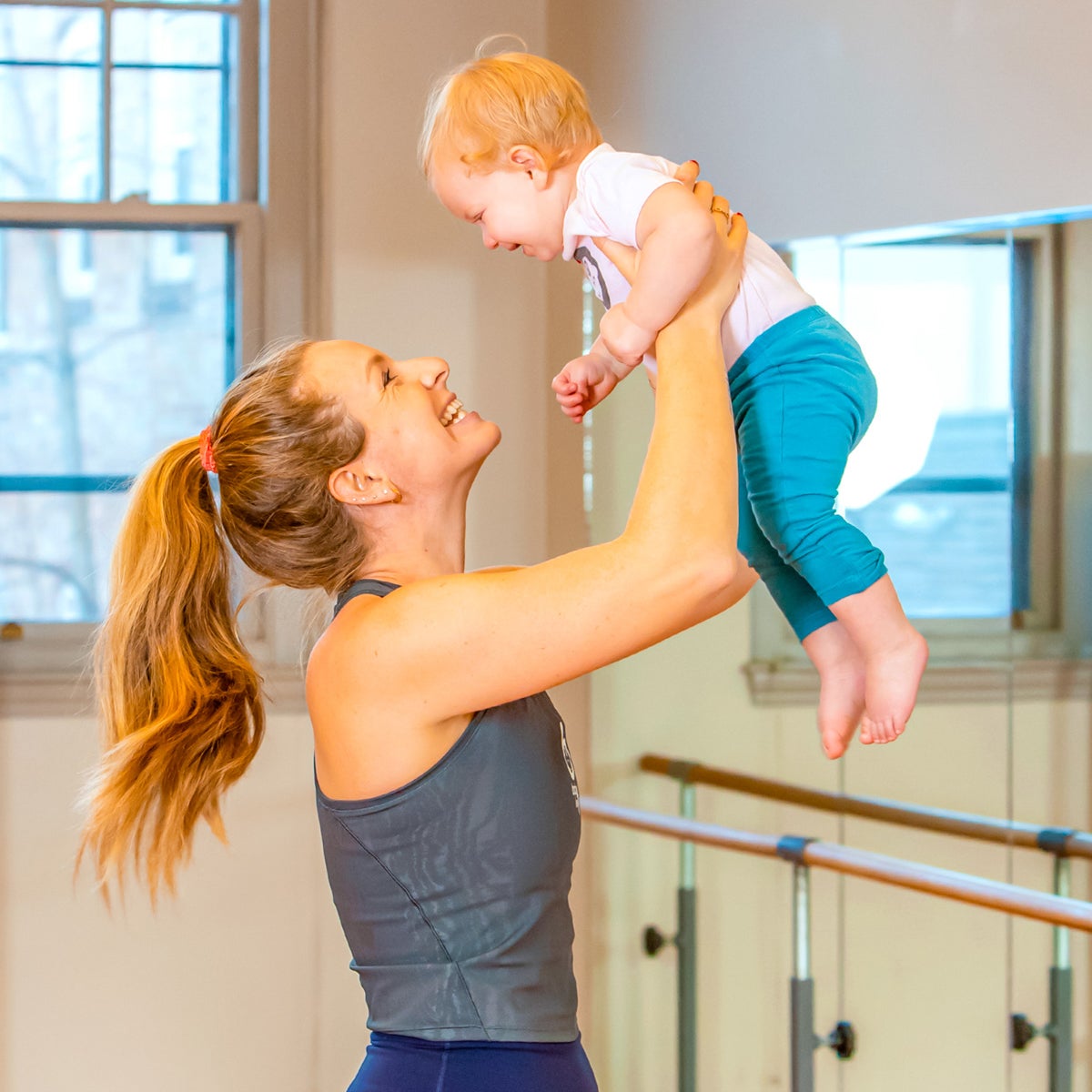 While parents are encouraged to do the workouts toting their infants in wrap carriers worn on the back or front, that’s not a requirement.