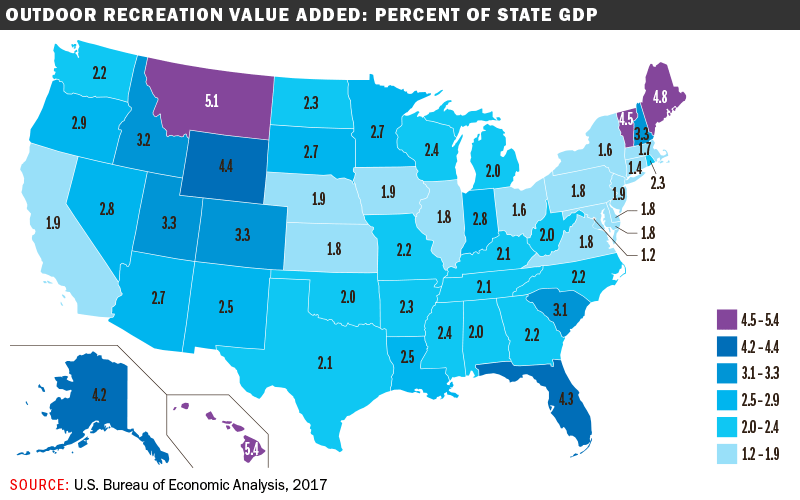 That puts Maine in the No. 3 spot after Hawaii and Montana for a sector that supports 40,720 jobs in the state or 6.4% of Maine’s total and provides close to $1.4 billion in wages and earnings. The vast majority of outdoor dollars come from private industry, which generated $2.8 billion in 2017.