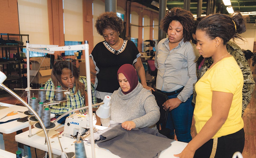 Spread out over 14,000 square feet, it's more than triple the space of the textile company's original Portland location. On a lower floor, Ben's mother, Dory Waxman, runs Old Port Wool & Textile Co. and a sewing school that trains mainly immigrant women as stitchers for American Roots and other employers. Photos in the corridors of a bygone manufacturing era add to the ambiance.