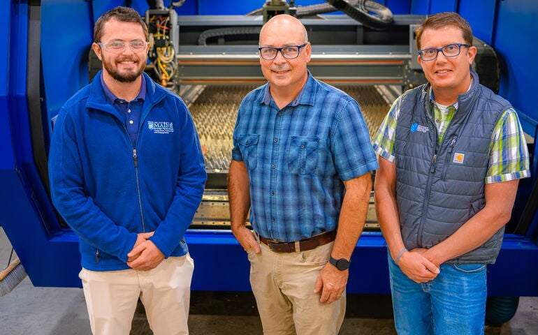 Members of the management team of the University of Maine’s Advanced Manufacturing Center in Orono, in front of a laser cutting machine. From left: Brad Denholm, associate director of workforce development; John Belding, director; Forest Wentworth, associate director of projects. PHOTO / JIM NEUGER