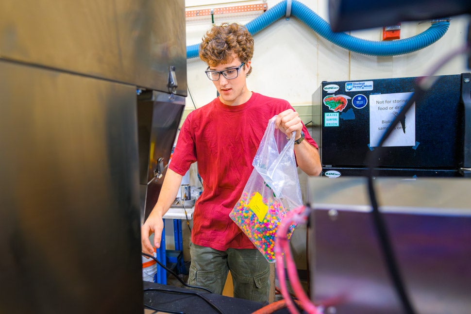 Daniel St. John, a junior majoring in mechanical engineering, bags blueberry-size beads for testing in a harvester prototype at the University of Maine’s Advanced Manufacturing Center in Orono. PHOTO / JIM NEUGER